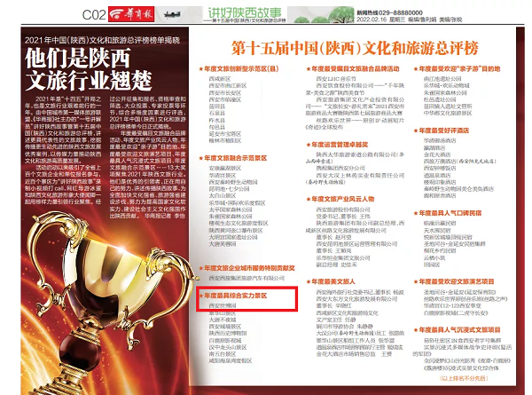 由中国第一城市媒体旅游联盟及《华商报》社共同主办的第十五届中国(陕西)文化和旅游总评榜于2月16日荣耀揭榜,西安世博园喜获“最具综合实力景区”奖。