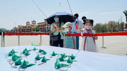 儿时记忆里的端午,是线网里兜起的咸鸭蛋,是脖子上挂着的香囊,是守着一双拿起苇叶翻飞的手,也是一枚裹上糖的粽子。而本次活动具有鲜明的传统民俗特点,让游客朋友们充分感受仲夏欢趣,体验儿时记忆。活动现场节日氛围浓厚,精心布置的特色美陈以及龙舟造型拍照打卡点,深受欢迎。