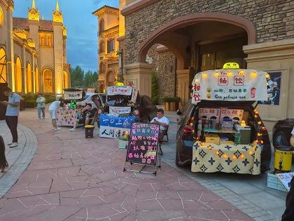 走进罗曼街区,华灯初上,月色迷人,白天的闷热已渐渐散去,夜间生活的“热浪”正悄悄兴起。不同于传统的夜市模式,这里集结了三十余辆汽车,打开后备箱,配上自制招牌,挂起氛围灯,支起折叠桌椅,一辆车就是一家店,各类精品咖啡及消暑饮品任凭游客选择,创意摊位上的精品摆件、可爱盲盒等也备受游客欢迎。“后备箱集市”新潮、有趣又文艺,在贩卖商品的同时使游客感受到新潮的娱乐方式及社交体验,浪漫惬意的氛围瞬间拉满,成为罗曼街区夏夜一道靓丽的风景。