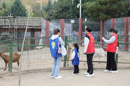 走进萌宠馆,特殊儿童热情地和羊驼、长颈鹿、骆驼、孔雀等动物打招呼,并给动物们喂食。随后的亲子互动环节里,孩子们纷纷捡拾落叶,发挥奇思妙想,用画笔和树叶制作手工创意画。不一会儿,一幅幅生动的秋景图便跃然纸上。在充满趣味性和锻炼专注力的“套圈圈”游戏中,孩子和家长们玩得不亦乐乎。几名孩子套中心仪的小玩具后,兴高采烈地和医护人员、志愿者们分享喜悦。最后,大家来到长安塔下,志愿者们给每组家庭拍照留念,记录这次愉快的旅行。