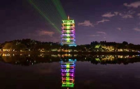 近日,一组浐灞生态区夜景照高频亮相中央电视台新闻频道,在夜空中上演了一场场光影盛宴,刷爆朋友圈。在西安世博园内,以“祖国万岁”为主题的灯光秀在地标建筑长安塔上演,4组激光设备在长安塔99米高的塔体上呈现出“我爱你中国”字样,向祖国深情告白,成为浐灞夜景的一处亮点。长安塔彩灯和激光技术结合,通过光影展现出色彩的变化,呈现出炫酷的视觉效果。