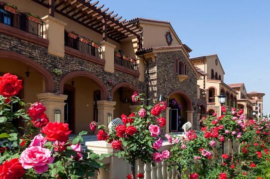 罗曼街区玫瑰树竞相绽放