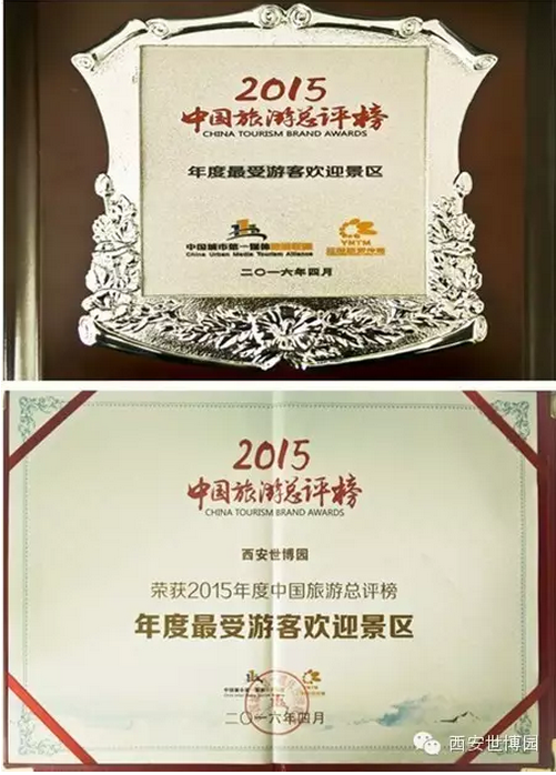 2016年4月22日,由中国城市第一媒体联盟、云报旅游传媒主办的2015中国旅游总评榜颁奖典礼在云南丽江隆重举行,来自北京、河南、陕西、山东、浙江等全国24个省、市、自治区的旅游行业精英、旅游媒体汇聚丽江,见证全国总榜揭晓。在本次颁奖典礼上,西安世博园荣获“2015中国旅游总评榜年度最受游客欢迎景区”奖项,这是西安世博园继荣膺“2013中国旅游总评榜年度最受欢迎景区”、“2014中国旅游总评榜最受欢迎旅游品牌大奖”称号后,连续第三年获得殊荣。