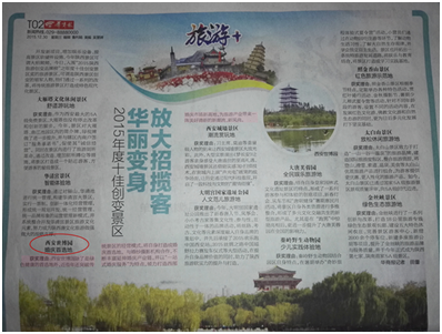12月30日,由中国城市第一传媒联盟、华商报共同举办的“2015陕西旅游创变品牌榜”评选活动揭榜,西安世博园荣登榜单,并喜获“年度十佳创变景区”。