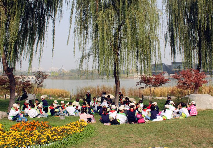 师生们在世博园锦绣湖畔野餐