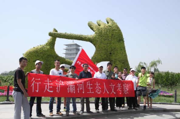 考察团成员在世博园“送你一个长安”绿雕前合影留念