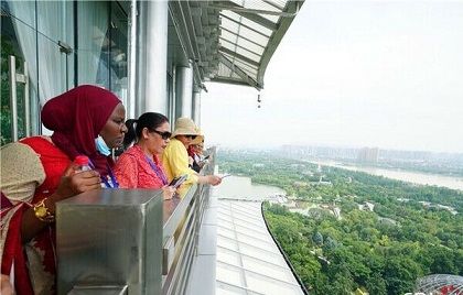 7月6日,“一路有你·全运有约”驻华大使夫人西安行活动走进世博园。来自加蓬、冈比亚、印度尼西亚、马里、毛里求斯、马达加斯加、尼日尔、巴基斯坦、塞拉利昂、萨摩亚10个国家的10位驻华大使夫人以及埃及驻华使馆文化、科技、教育参赞共11位嘉宾参访“三河一山”绿道起点,登临长安塔,远眺世博园,体验绿色浐灞、生态浐灞。
